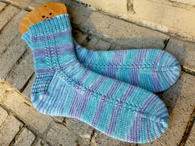 /Finally, these socks are purse knitting no longer! I knit them on a road trip through Georgia, running errands around town, in restaurants, in bars, at knit night, and even in front of the television. Now I can wear them and keep my feet warm while knitting something else. Must implement this plan when it actually feels like Fall.