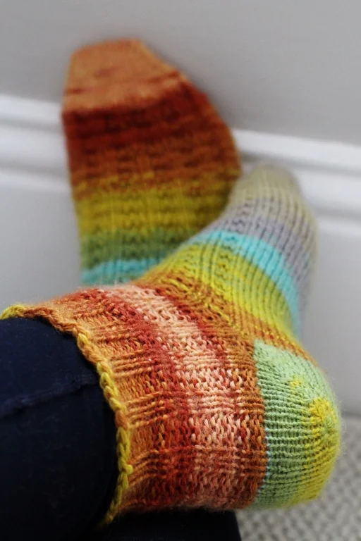 /My sock drawer might be close to overflowing, but it’s been awhile since I’ve knit myself a pair of cushy socks to wear to bed. At night, my toes can get painfully cold and thick worsted-weight socks are the only answer. My favorite pair of bed socks - they’re also the first pair of toe up socks I ever made way back in 2007 - finally saw enough wear to develop a few well placed holes. I have every intention of darning them. Eventually. In the mean time, I need another pair of socks in the rotation. So, hello rainbow waffle socks.