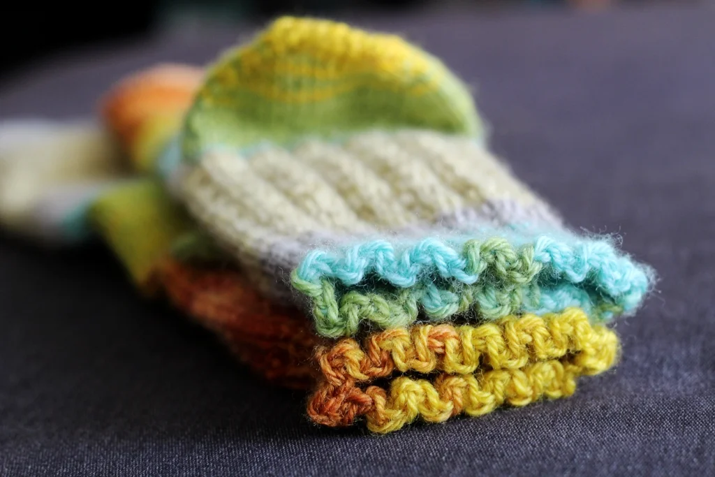 Once there were enough stitches on the needles I went with one of my favorite stitch patterns, the waffle rib, because it’s stretchy, fun to knit, and good looking. It added just enough texture to keep the knitting from getting boring, especially during the larger color blocks. Since there was only 244 yards and I wanted a longer cuff, the afterthought heel was the way to go. I followed the steps in this tutorial to open up and knit the heel.