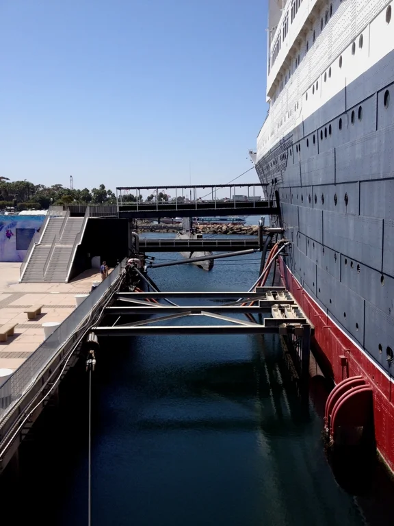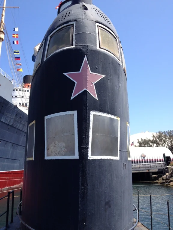 Until the Bearded One and I went down to visit the Queen Mary, I had no idea The Scorpion Submarine existed or that touring it was even an option. Once we knew that we could, we couldn’t pass up the chance to see it. After buying our tickets and passing through the gift shop, we crossed a bouncing gangplank to the Scorpion’s top deck before climbing down into the sub.