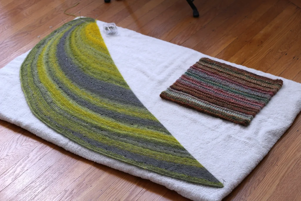 /What happens when you have to block your knitting (shawl, lace, mitts, color work, what have you) and are completely lacking in pin-ready space? You make your own blocking board. After finally binding off a small shawl I was ready to block it, but I’d just moved to a place without carpet. I couldn’t take over the bed or furniture either with wet garter stitch and pointy pins. Foam mats weren’t in the cards either. The good news was that moving left me with plenty of boxes that I could use instead. If you’re in a similar spot, here’s what you’ll need: