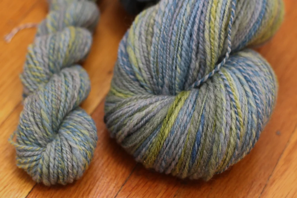 So much of my handspun starts simply with the urge to spin and these skeins were no exception. I had no end project in mind and went digging through my fiber for the first thing that caught my eye.. The winner was 4 oz of Falkland top from Cosy Makes. She no longer dyes and this bump was one of the last she sold to clear out her stock. It was also the last bit of her lovely work in my stash so I wanted it to be more than mindless spinning.