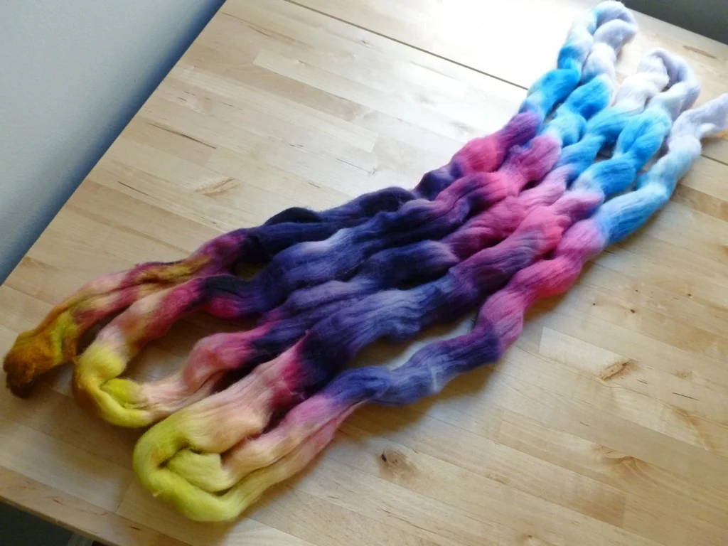 6 oz of un-dyed Corriedale Cross. Sometimes you just need a few neutrals to balance out all the color. Thinking about about pairing it with the purples, greens, and blues of the Corriedale from Gale’s Art. Maybe I’ll try spinning my first skein of sock yarn.