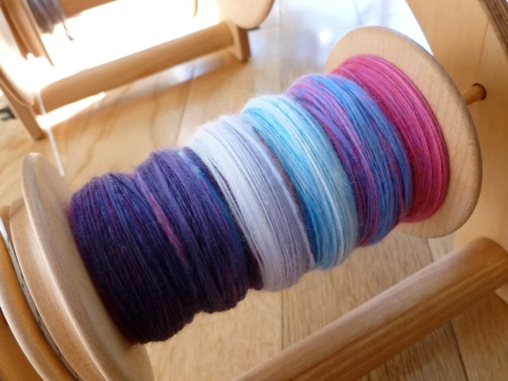 Last week I remembered that it was almost time for the latest club shipment to show up in my mailbox. April’s package, Olivia, was still hanging out on the wheel and I thought there’d be just enough time to finish. Didn’t happen. When the package arrived, there was still yard after yard of single to spin but May’s colors were the perfect kick in the butt to finish. The sooner Olivia is off the wheel, the sooner I can start spinning up Potted.