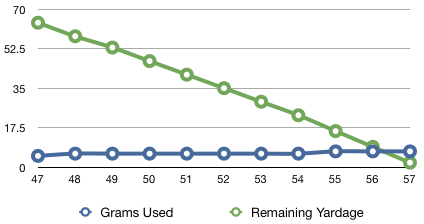 Sci-fi reference aside, another reason I cast on for Hitchhiker was because I wanted a pattern that would use up 2 skeins of Malabrigo sock and that could easily be made larger. Check and double check. Since I wanted to get the most out of the yarn and spare myself from ripping out, I started measuring how many grams of yarn were used per tooth. From the 48th to the 54th tooth, the teeth used 6g each with the 55th, 56th, and 57th teeth using 7g each. There were 2g left after binding off the last tooth. The kitchen scale has turned out to be one the best knitting tools I’ve ever bought. Full technical details on Ravelry.