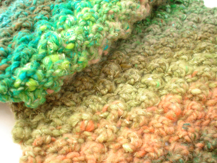 Despite how complicated the scarf looks, the knitting was pretty easy. I read a few books while working the first few feet and the last few feet got me through the after effects of a root canal. I have to love the scarf just for that. The yarn helped too. Even the knots and the vegetable matter didn't detract from its colorful goodness. I'm looking forward toward pulling the scarf out in the Fall when the color will be a welcome sight and when wrapping one's self in wool will actually be comfortable.