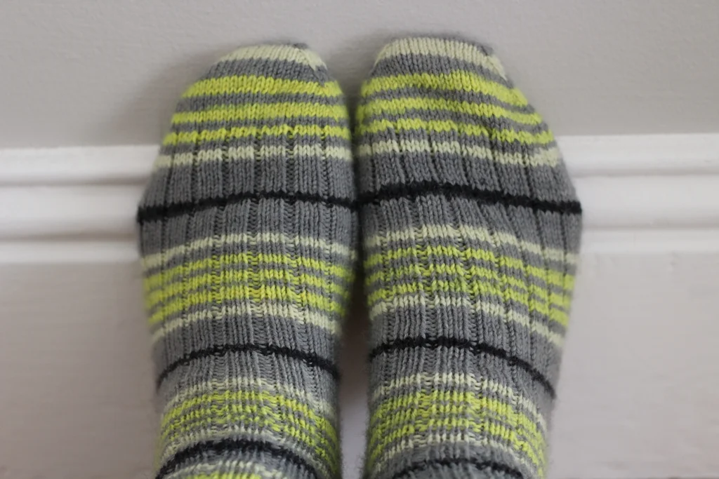 After making these two pairs, I decided to knit the Bearded One socks with different yarn. I still love the color and the stripes, but I don’t think they’d look as nice at a larger stitch count. 64 - 70 stitches around seems to be the limit before the stripes turn to static. And I definitely need more than 70 stitches per round to make him a pair of socks. Think I’m going to use the extra yarn to make the kid another pair of socks when she eventually outgrows her current pair. Until then, I’m going to tackle all that gift knitting that’s piling up. Cute unicorns don’t knit themselves.