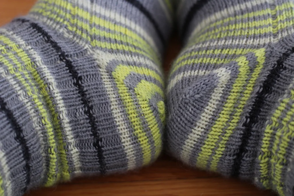 They look the same, right? The stripes match, except for the heels. They’re the same length from cast on to bind off. But they’re different.
