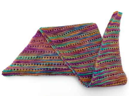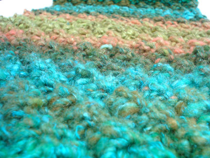 Despite how complicated the scarf looks, the knitting was pretty easy. I read a few books while working the first few feet and the last few feet got me through the after effects of a root canal. I have to love the scarf just for that. The yarn helped too. Even the knots and the vegetable matter didn't detract from its colorful goodness. I'm looking forward toward pulling the scarf out in the Fall when the color will be a welcome sight and when wrapping one's self in wool will actually be comfortable.