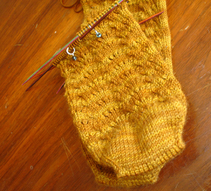 I like to knit lots of different things but every now and then I get stuck on something: socks, washcloths, toys, whatever. The last overriding object of my attention was socks (it's washcloths now but I'll save that for later). I'm not always sure what throws me over the edge but this particular sock knitting binge started when I was looking for the perfect pattern to go with a souvenir skein of Socks that Rock. Eventually, I picked Gentleman's Fancy Sock from Knitting Vintage Socks and I'd like to say it's a good pattern but, really, I have no idea since I modified it so much. Toe up with a reinforced heel flap and my own set of calf increases. Basically, I only kept the stitch pattern and what a glorious stitch pattern it is.