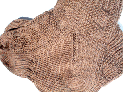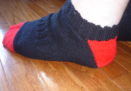 I’m very happy to say that my January socks, the first of my personal Sock-A-Month KAL, are finished and on time too. That second week into 2010, I started these socks because the yarn was calling me and I was helpless to resist. Since the yarn was my main reason for casting on, I wanted it to be the center piece and the dominate the pattern; however, plain stockinette just sounded really, really boring. Plus, interesting sock constructions were still bouncing around in my head.