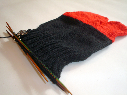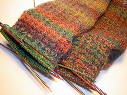 So, on January 8th, I took the plunge and cast-on with some Patons Kroy FX. What first attracted me to this yarn was the graduated color changes and I haven’t been disappointed. In order to best display the long color repeats of the yarn, I came up with an uncomplicated but not boring pattern. So far the pair is coming along nicely and should be finished by the end of the month. I might even have the pattern up at the same time.