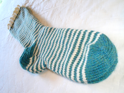 The scary thing about these wonderful socks is that I want to make so many more in so many different colors. Blue and white, green and orange, purple and blue... Plus, with a little more yarn, I could make knee highs. Now that's a good idea. Anyway, it seemed a shame to keep the pattern to myself so I'm posting it here. These sport weight socks are toe up with a gusset and heel flap and calf increases to get the most out of the yarn. Have fun knitting your own pair.