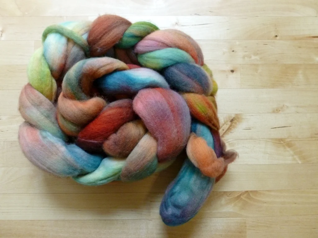 6 oz of un-dyed Corriedale Cross. Sometimes you just need a few neutrals to balance out all the color. Thinking about about pairing it with the purples, greens, and blues of the Corriedale from Gale’s Art. Maybe I’ll try spinning my first skein of sock yarn.