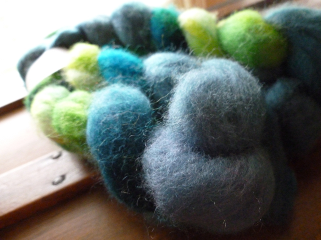 The latest addition to the collection is 4 oz. of Blue Faced Leicester from The Copper Corgi. I’m rather smitten with all those blues and especially the bright green. I have visions of bright green popping out from a swath of dark blue. Maybe 2-ply or maybe 3. I haven’t gotten that far yet. I’m still in the middle of spinning a polworth/silk blend which means the blue/green vision will have to wait in storage.