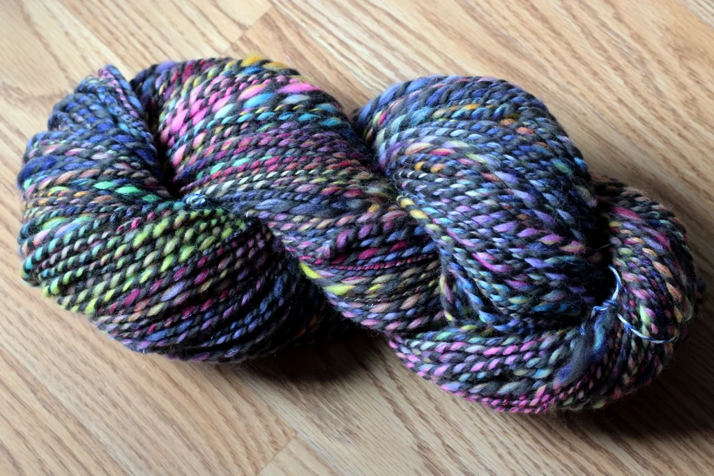 The second skein started as 4.2 ounces of hand painted top and turned into 260 yards of aran weight. I split the top in half down the middle. The first ply I spun as is and second I split in half again. It made a nice lazy fractal that I really want to knit. Pretty sure I've got enough yardage to make a small Boneyard Shawl if I knit at a loose gauge.