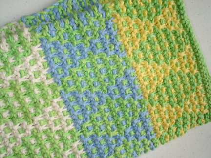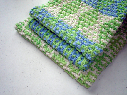Pattern: Bridges Towel and Laddered Cloth by me; Little Tent Dishcloth by Vaunda Rae Giberson, and All Washed Up by Jill Arnusch