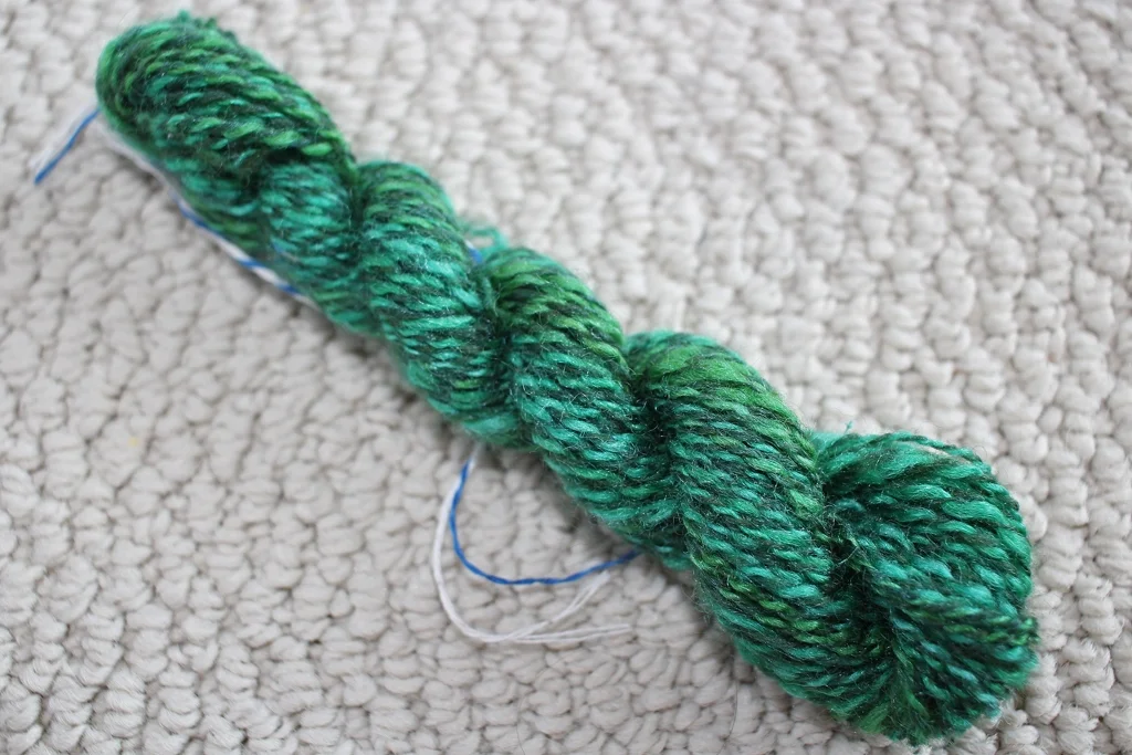 Time for an update on the epic green handspun project. When last we saw our fiber I shared why I bought this particular roving and my plans for sampling and spinning it. You can read more about that here. Our dashing roving has gone through quite a few transformations since then!