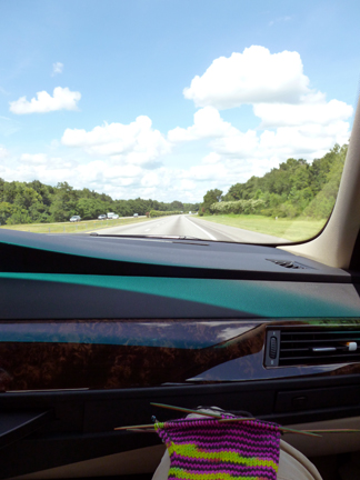 After awhile all the miles and trees and exits started to look the same. The sock-in-progress did too but it was much more interesting than the ever repeating mile. The humble little sock, if anything that bright could be called humble, also taught me a neat trick. When the light was just right, I could see my reflection and my knitting in the passenger side window. I got to keep an eye on my knitting and the outside world without having to choose between the two when something interesting - that river for one - came by.* So long as the pattern is simple and repetitive, such as stockinette or ribbing, knitting by reflection shouldn’t be too hard. I wouldn’t want to try it with fair isle though.