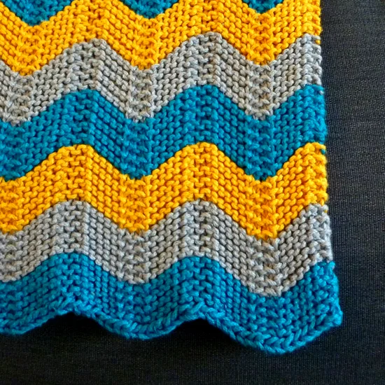 Here’s what the woven in ends look like on the wrong side of the knitting. The tails follow the curve of the chevron with no problem and are quite secure. A quick note: I waited to cut the tails until after the blanket came out of the washer and dryer.