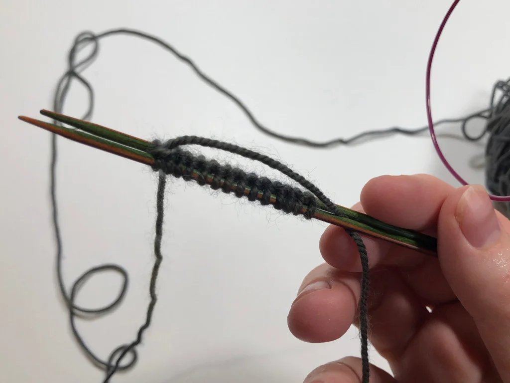 7. Take the tail yarn and tuck it between the needles next to the first stitches. It should sit on the same side as the purl ridge created by the cast on. You’ll have to hold in place until the first few stitches are worked, but then it will be secure.
