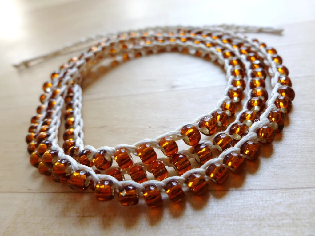 On the same day I wrote about the first Peppercorn Bracelet, my mom sent me an email asking me to make one for her too. My Mom’s absolutely awesome so she went to the top of the list. When I was out and about searching for yarn, I found the perfect bronze-colored glass beads in a yarn shop. A good trip.